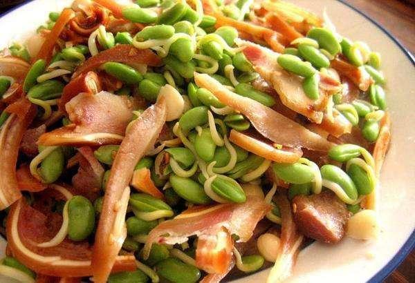 材料:卤猪耳、绿豆芽、姜丝、红椒丝、香菜、盐、白糖、味精、芝麻油